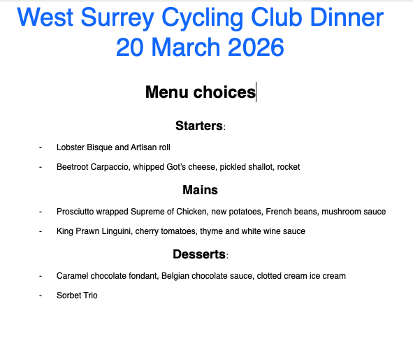 This is an informal event but there will be a short presentation after dinner at which the awards will be made of the various club trophies to mark the achievements of members who have contributed the most during the last year in leading club rides and participating in our activities.