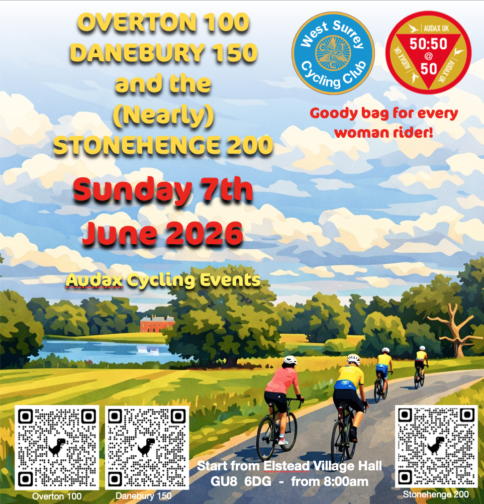 The club will hold the Overton 100k, Danebury 150k, and Stonehenge 200k Elstead Audaxes on June 7th, continuing a tradition since 1978.